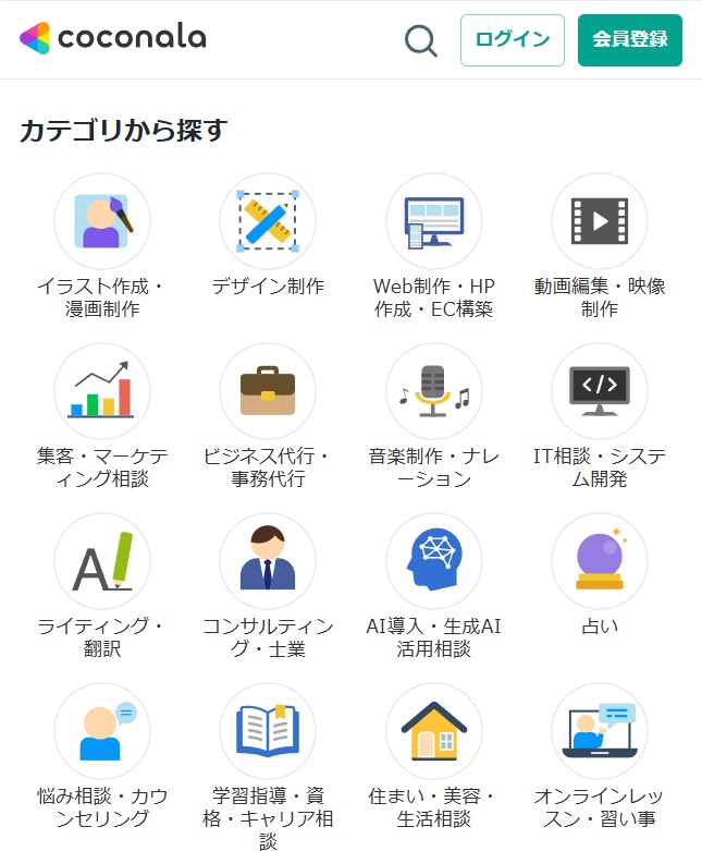 ココナラは、得意をサービス化して販売できるスキルマーケットです。単発で受けやすい依頼もあり、空いた時間に副収入を作りやすいのが魅力です。