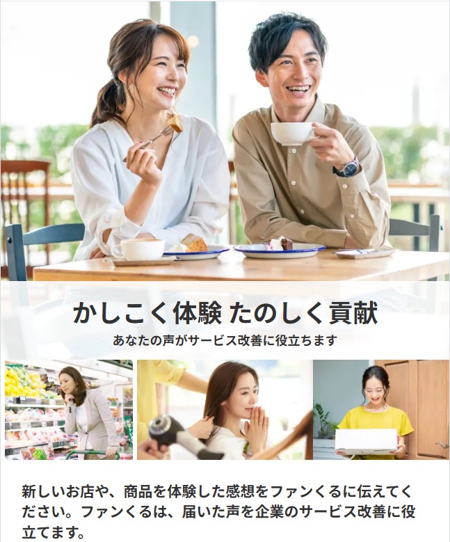 ファンくるは、飲食店などを体験しながら謝礼がもらえる「覆面調査」系サービスです。楽しみながら取り組める案件があり、スキマ時間を活かしたい人にも向いています。