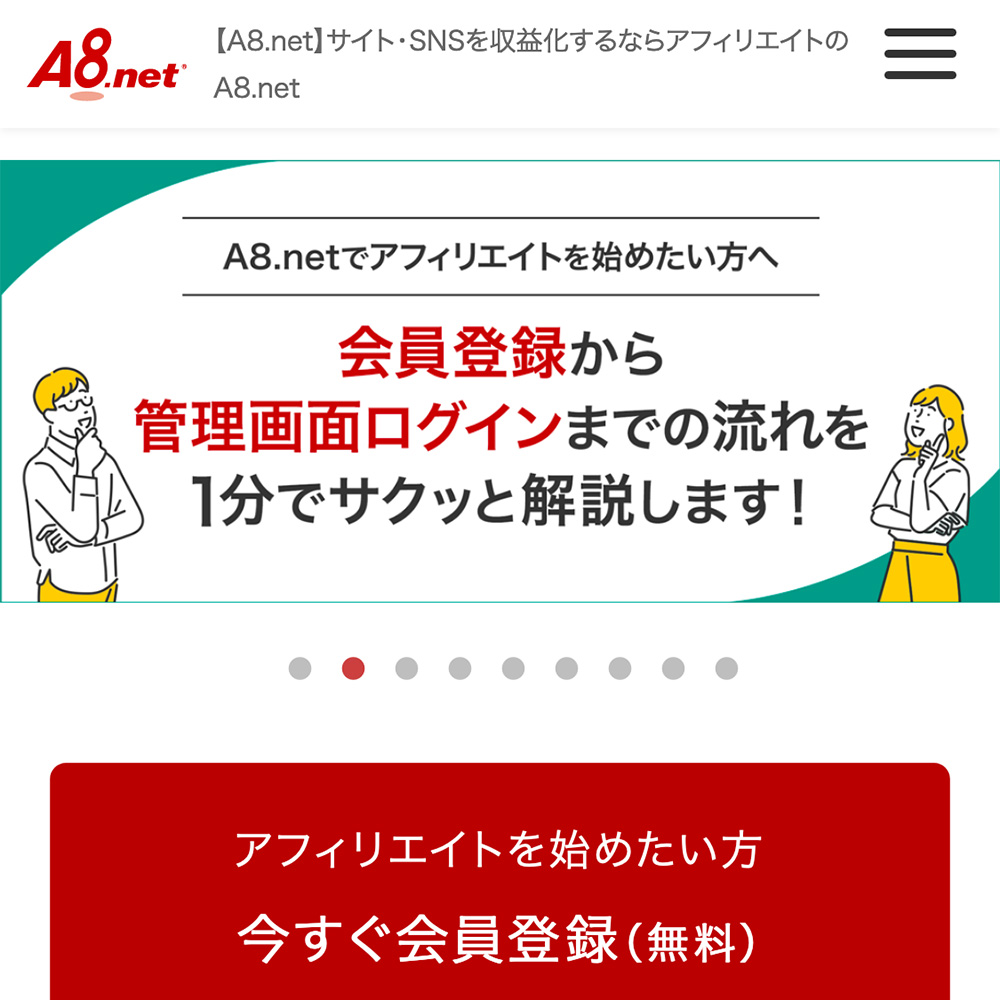 A8.netは、アフィリエイトを始めたい人向けの定番サービスです。広告が豊富で登録無料。セルフバックなどもあり、最初の一歩を踏み出しやすい仕組みがあります。